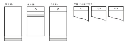 袋子頂部橫壓一條熱縫線,把袋子分成兩部分:卡頭和產(chǎn)品袋兩個(gè)空間,而制成的小商品包裝袋。袋子的頂部或印刷或空白,袋子中間夾層珠光膜或可直接印刷圖案,如果上邊為卡頭下邊分兩個(gè)以上的盛裝物品的空間袋腔,可又稱為卡頭子母袋。